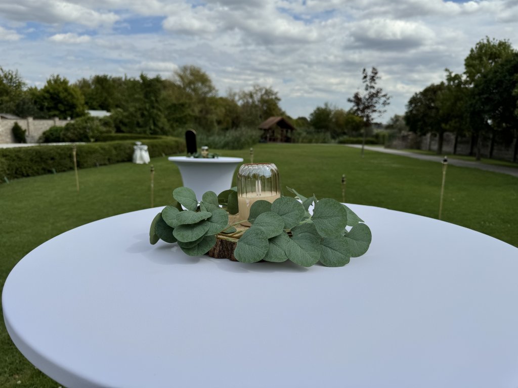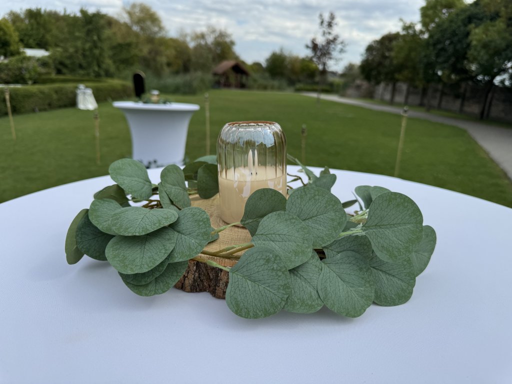 Ha igazán romantikus és természetes hangulatot szeretnél az esküvődön, az akác korongos díszünk tökéletes választás. A 25 cm átmérőjű, valódi akácfa korongon elhelyezett élethű eukaliptusz levelek és az elegáns mécses meghitt fényt varázsolnak a vendégasztalokra.